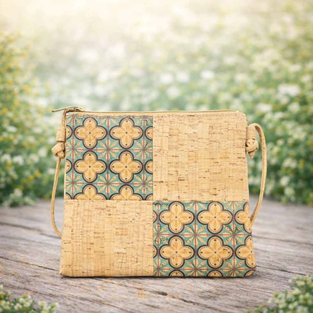 Natural Cork Crossbody Blue Flower Tile Patterned Sling Bag